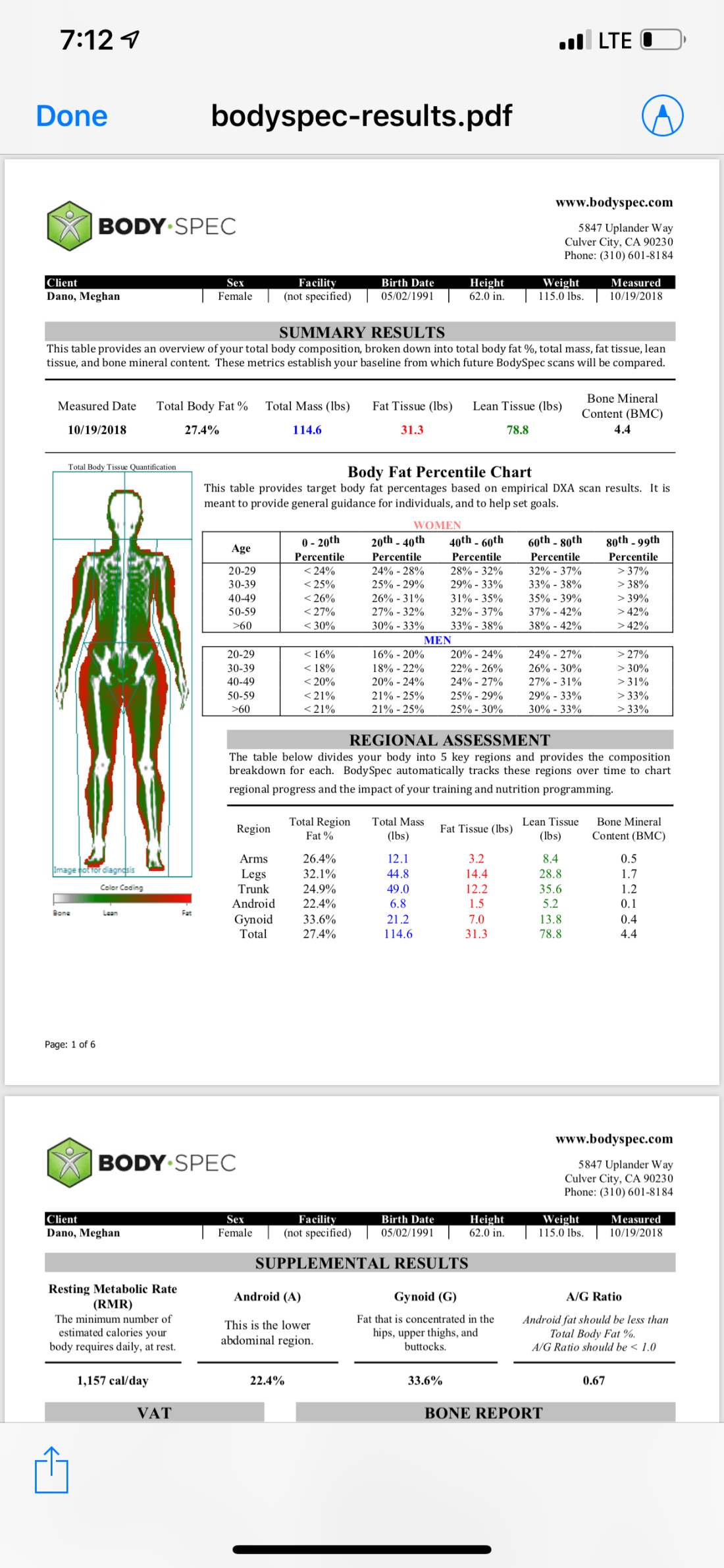 Overview: My first program that I will be following is the very trendy and now popular flexible dieting or better known as If It Fits Your Macros (IIFYM). I am working with my personal trainer to work through a personalized nutrition program to cut body fat. To track my progress I did an initial DEXA scan. This measures your lean muscle mass and fat tissue in several portions of your body. My body composition results showed I currently sit at 27.4% body fat. Detailed results can be found below.